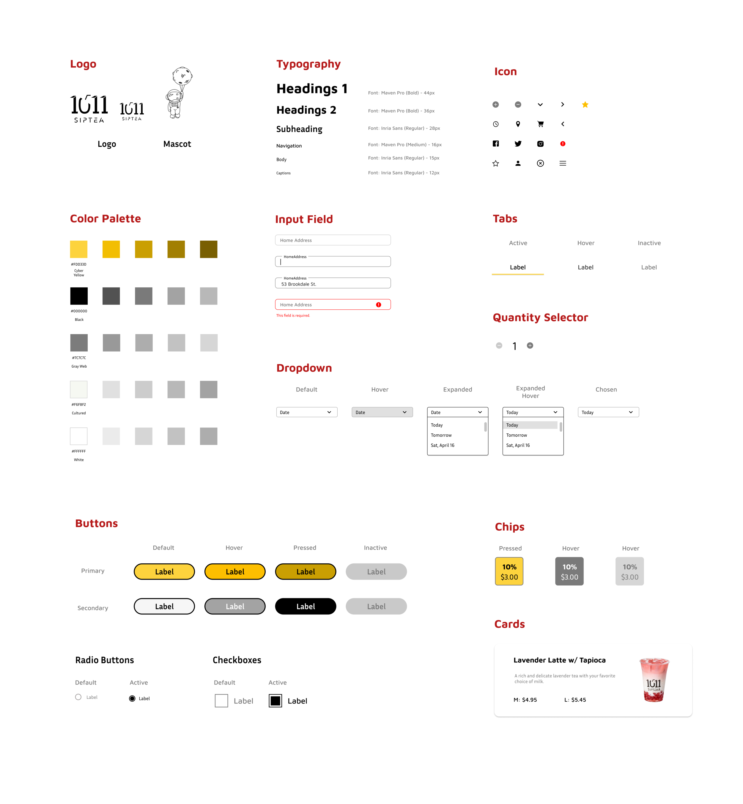 Their branding adjectives are tasty, casual, modern, and futuristic. I started with a UI Kit to create components that I can use moving forward. I want to maintain consistency throughout the website and that all UI elements are cohesive and aligned with 1011 Sip Tea’s brand. The color palette relates to the shop’s astronaut mascot and futuristic tone. I chose Maven Pro (sans-serif typeface) because of its unique curvature, flowing rhythm, and modern design. View the UI Kit in detail by clicking on the image below.