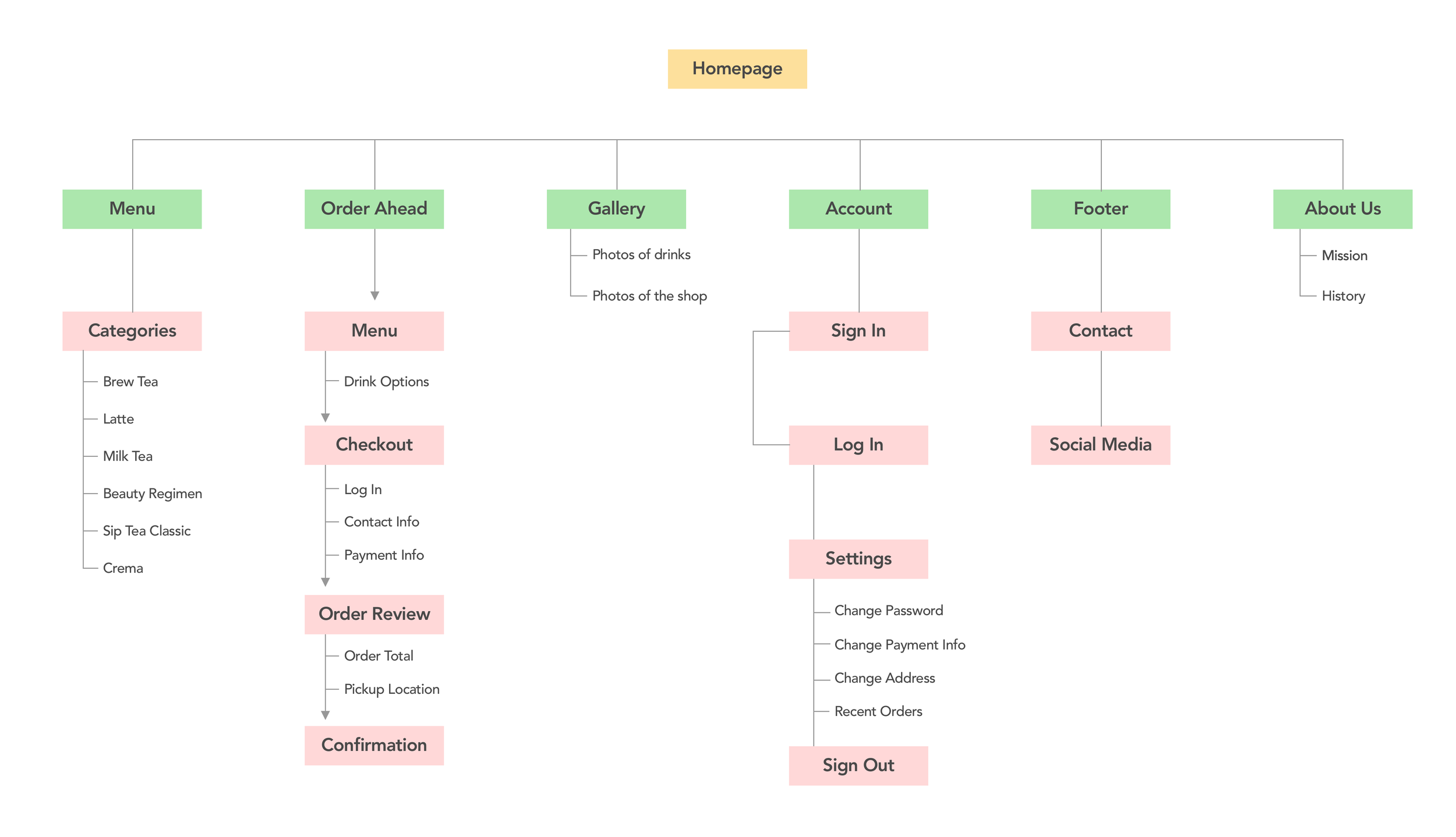 To help me understand how to structure the website, I created a sitemap. The ordering ahead category in the navigation bar has the most pages since the other categories only display the shop's menu and branding.