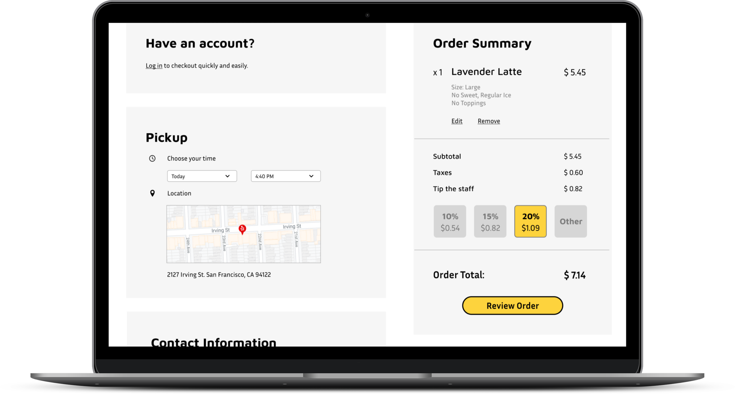 Users stressed the importance of flexibility, especially in scheduling pickup time. Thus, I created a checkout page that enables those abilities.