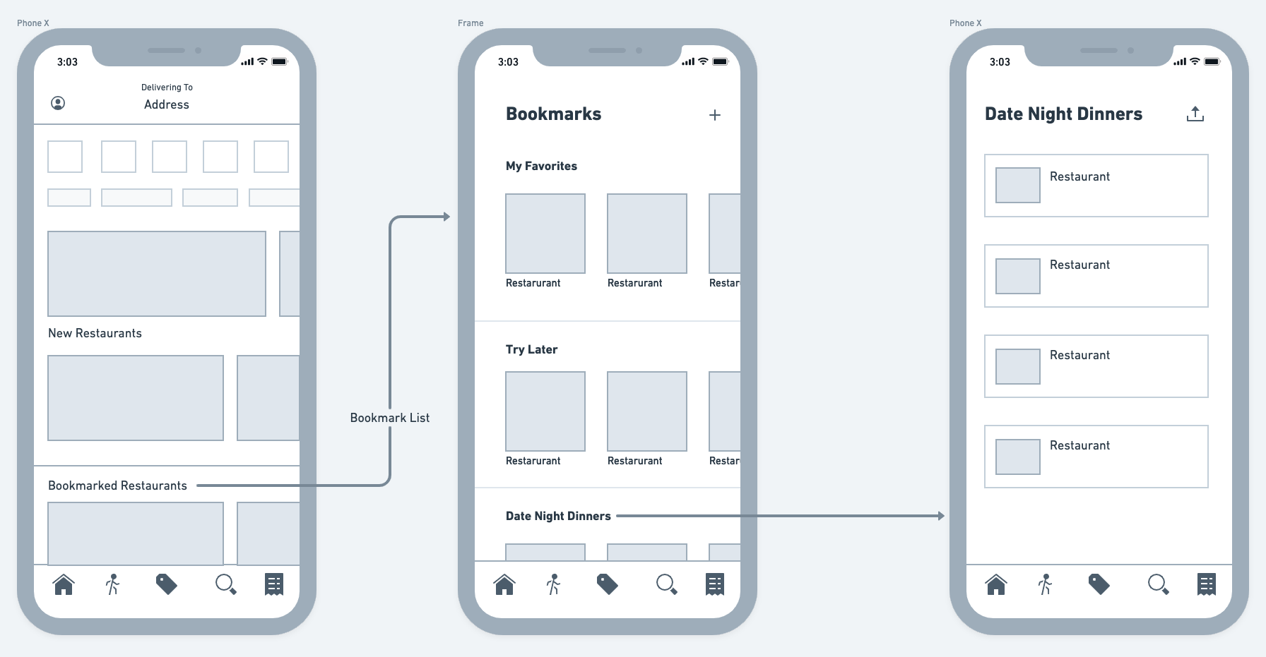 I wanted to know the best location for the bookmark feature because I’ve seen it in different areas of various apps. UberEats have the bookmarks placed within the account page, and I was curious if users can easily find the bookmarks there. There were other bookmark areas I had in mind that I wanted to try out. So I created wireframes and placed the bookmarks feature in different locations on the app.