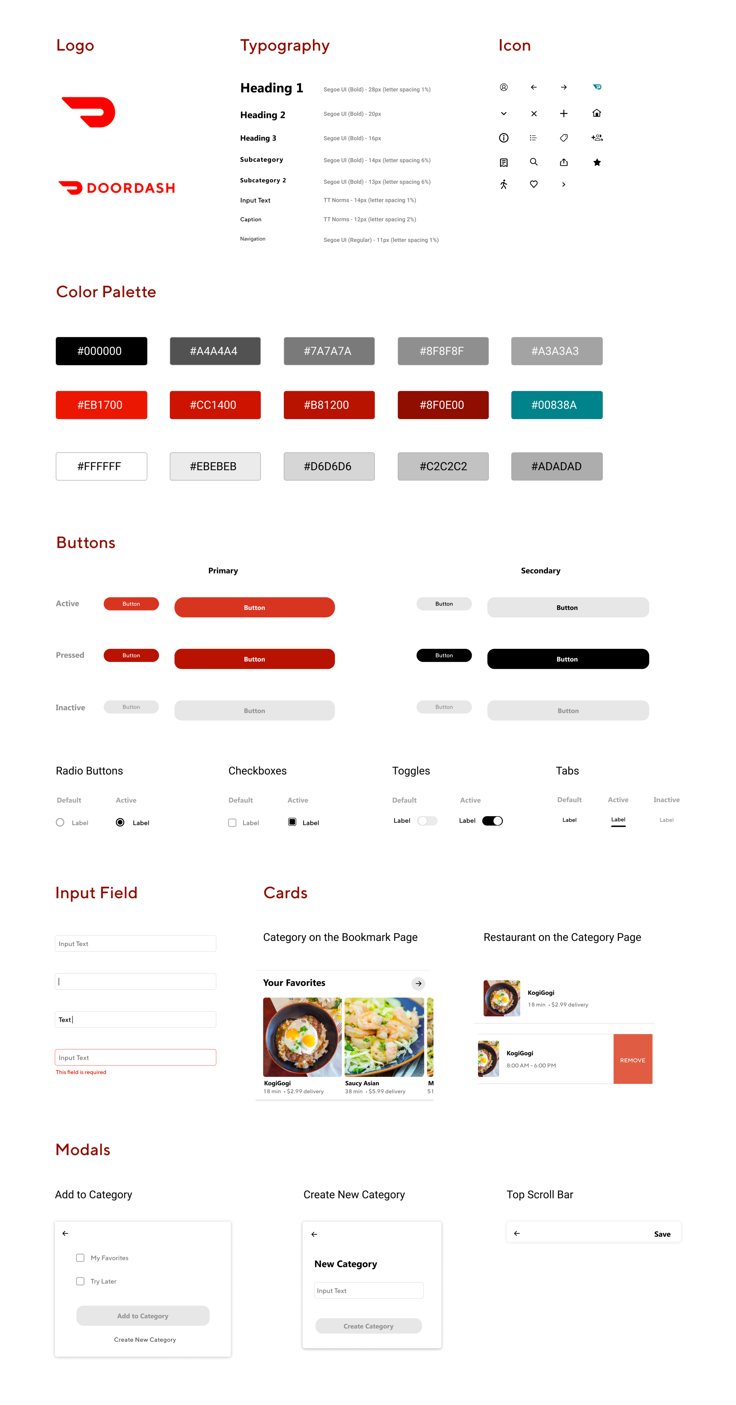 After gathering some layout inspiration from my Moodboard, I created my own modal and card designs. Other parts of the UI Kit are components from the DoorDash app. I can reference these components throughout my project to make sure elements align with the branding and app.